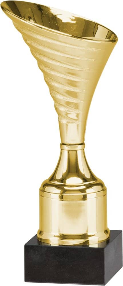Наградный кубок за первое место изготовленный из металлизированного пластика. В чаше памятного кубка для соревнований предусмотрено крепление, в которое Вы сможете вставить фигурку по случаю. Стем кубка победителя так же изготовлен из металлизированного пластика с золотым напылением, который расширяется к низу. Цоколь сувенирного кубка для соревнований выполнен из черного мрамора квадратной формы, на котором можно разместить табличку с надписью.